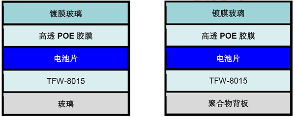 在雙玻組件中應(yīng)用的封裝結(jié)構(gòu)                                 在單玻組件中應(yīng)用的封裝結(jié)構(gòu)