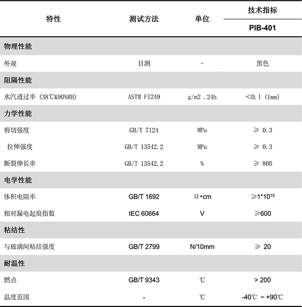PIB-401 系列邊緣密封膠一款丁基型光伏組件邊緣密封膠,其具有優異的水汽阻隔性能、粘結性和長期耐候性能,與常規封裝材料如 EVA、POE 等都具有良好的兼容性,用于敏感性電池CIGS、CdTe、HJT、鈣鈦礦等光伏組件的邊緣密封可以有效延緩組件在戶外高溫高濕環境下水汽侵蝕。